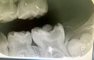 Durante la exploración clínica, realizamos una radiografía inicial que nos permitió confirmar el diagnóstico: el cuerno pulpar del diente afectado se había retraído por completo. Este hallazgo determinó la necesidad de realizar un tratamiento pulpar más profundo: una pulpectomía.